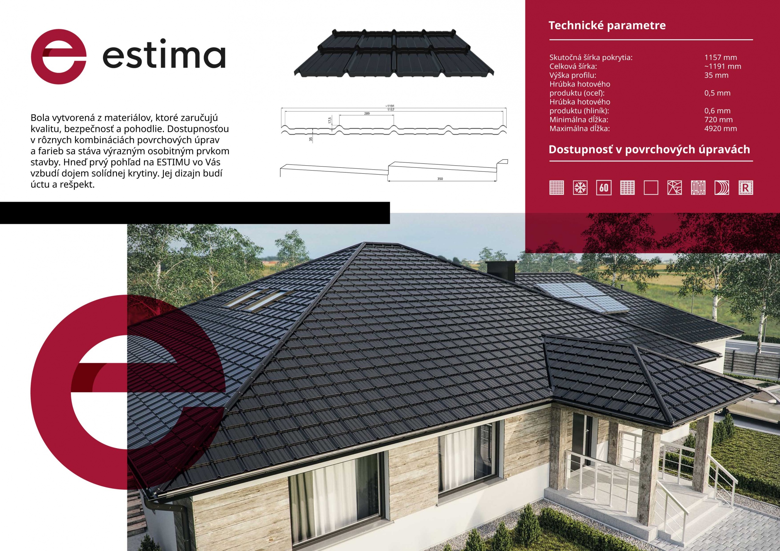 ESTIMA je symetrická plochá plechová škridlová krytina, ktorá má vďaka patentovanému systému bezpečného profilovania (SPS) veľmi dobré technické parametre.